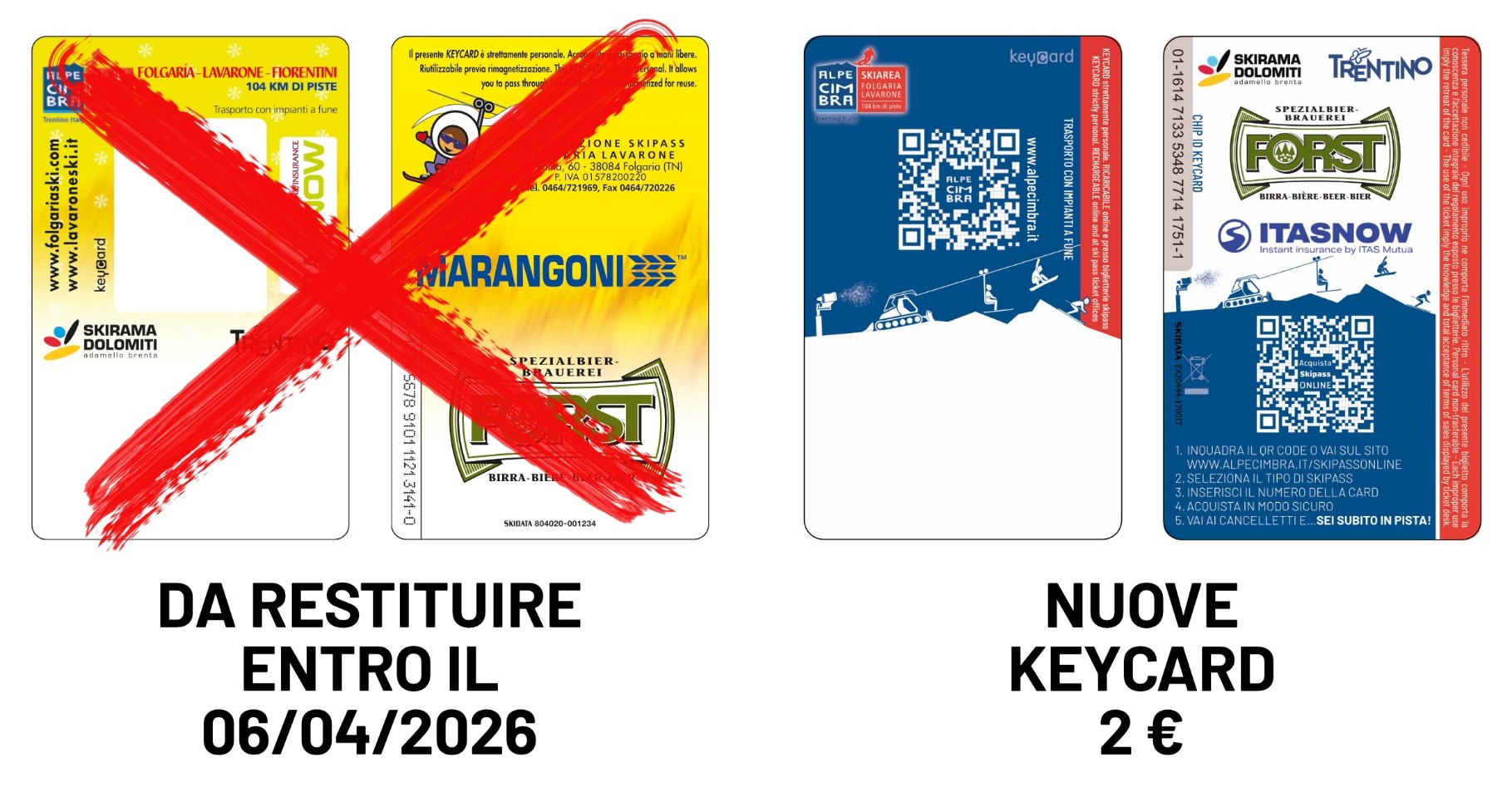 A partire dalla stagione invernale in corso, le keycards plastificate “gialle” sono state sostituite dalle nuove keycards “blu” che vengono vendute ad € 2 cadauna.